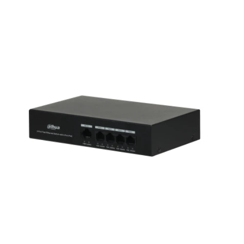 يحتوي السويتش على 5 منافذ RJ45 بسرعة 10/100 ميجابت/ثانية، منها 4 منافذ تدعم PoE ومنفذ واحد للربط بالشبكة (Uplink)، مما يجعله خيارًا مثاليًا للأنظمة الصغيرة مثل المتاجر، المكاتب، والمنازل.