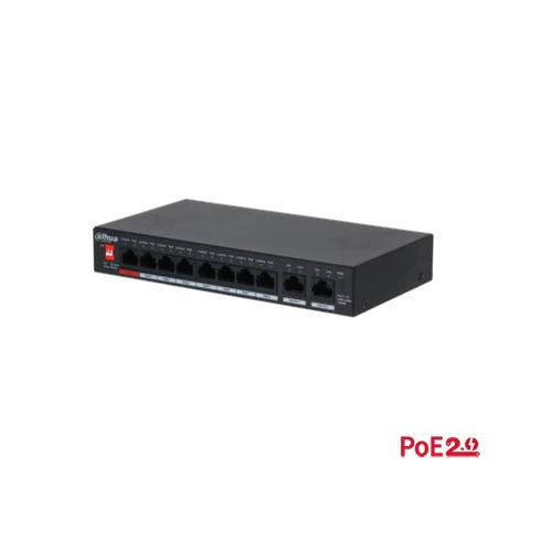 يحتوي على 10 منافذ RJ45 بسرعة جيجابت (10/100/1000 ميجابت/ثانية)، منها 8 منافذ PoE لتشغيل الكاميرات مباشرة، بالإضافة إلى 2 منفذ Uplink لتوصيل الشبكة الأساسية أو جهاز التسجيل NVR.