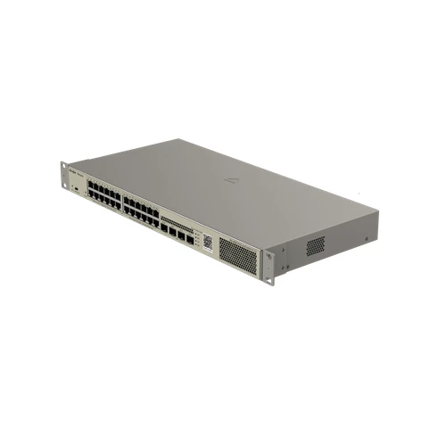 يحتوي السويتش على 24 منفذ RJ45 بسرعة جيجابت مع دعم PoE/PoE+ و 4 منافذ SFP للاتصال بكابلات الألياف الضوئية لمسافات طويلة، مع إجمالي طاقة PoE قدره 370 واط لتشغيل جميع الأجهزة المتصلة دون الحاجة لمصادر طاقة إضافية.